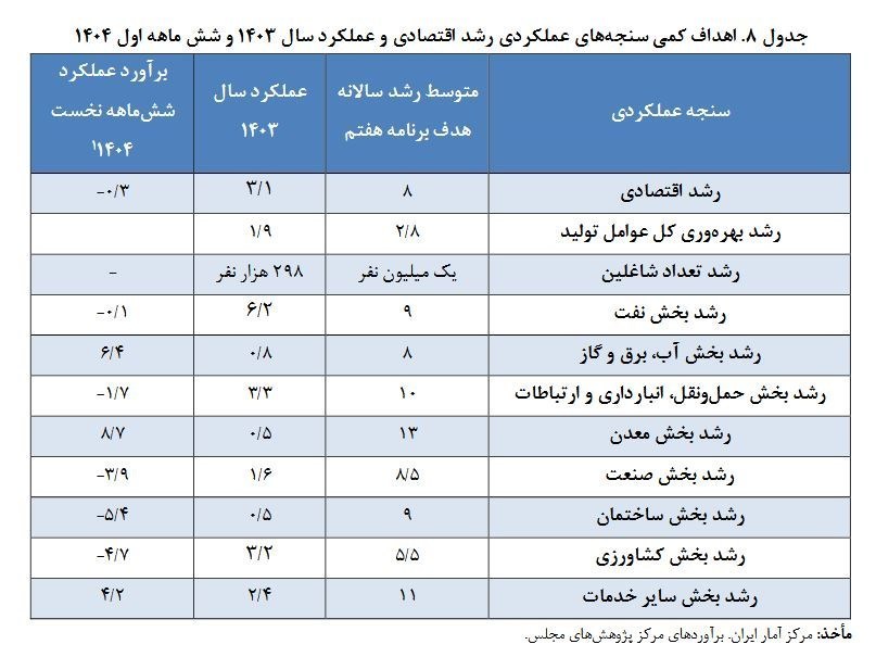 به گزارش خبرنگار اقتصادی خبرگزاری تسنیم، جدیدترین گزارش نظارتی مرکز پژوهشهای مجلس شورای اسلامی، تصویری نگرانکننده از عملکرد اقتصادی کشور در سال اول اجرای برنامه هفتم پیشرفت ترسیم میکند، این گزارش با عنوان «ارزیابی عملکرد برنامه هفتم پیشرفت تا پایان شهریور 1404» نشان میدهد که شکافی عمیق میان اهداف برنامه و واقعیتهای اقتصادی وجود دارد؛ بهطوریکه هدف رشد اقتصادی 8درصدی، در ششماهه نخست سال 1404 به عملکرد منفی 0.3درصدی سقوط کرده است.