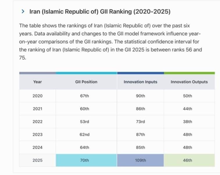 شرایط فعلی بهرهوری در اقتصاد ایران چندان جالب نیست چرا که براساس آمارها ایران در سال 2025 در شاخص نوآوری و بهرهوری رتبه 70 را از میان 139 کشور به دست آورده است، براساس آمارها در سالهای اخیر آمار کلی ایران در این شاخص کاهش پیدا کرده است که نشان میدهد ایران در سالهای اخیر در نوآوری و بهرهوری وضعیت جالب و مناسبی نداشته است که بهنظر میرسد سیاست ایران باید در حوزه بهرهوری و نوآوری تغییر کند.